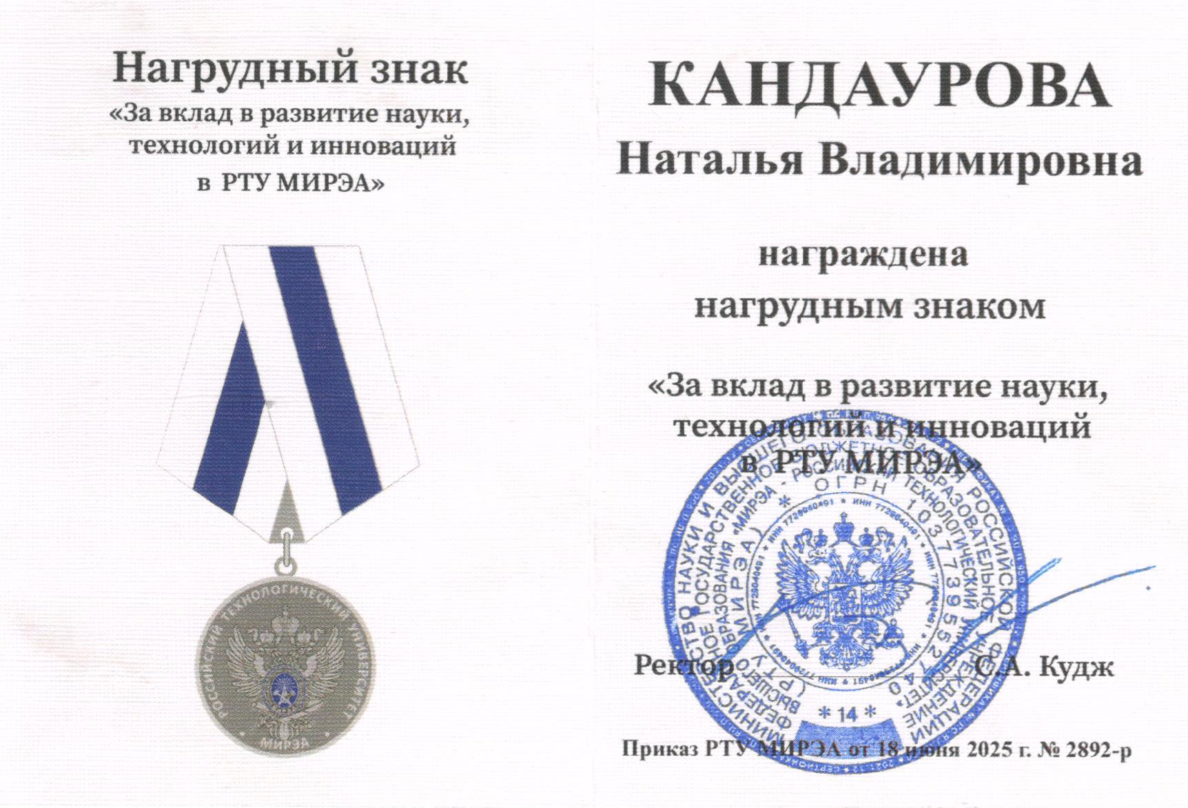 2024/2025 учебный год: Нагрудный знак РТУ МИРЭА «За вклад в развитие науки, технологий и инноваций в РТУ МИРЭА» Кандауровой Н.В.