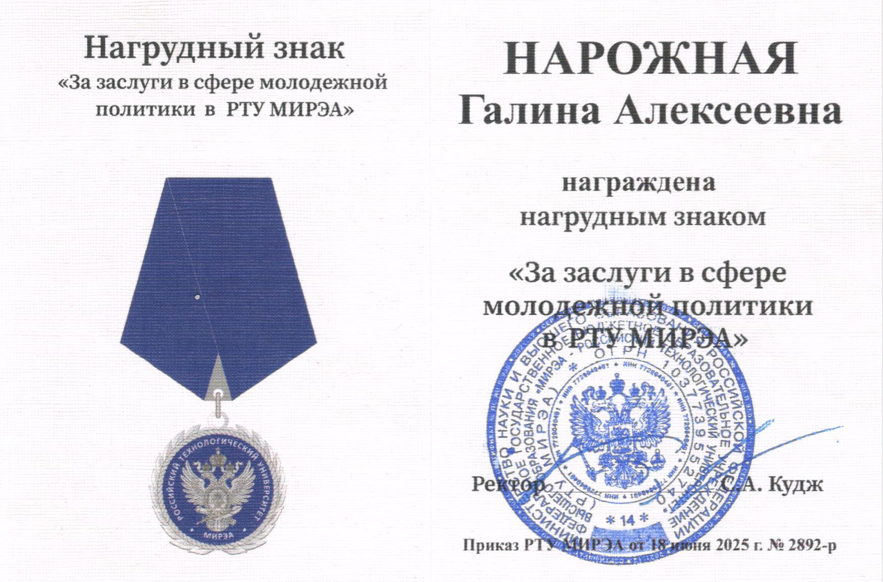 2024/2025 учебный год: Нагрудный знак РТУ МИРЭА «За заслуги в сфере молодежной политики» Нарожной Г.А.