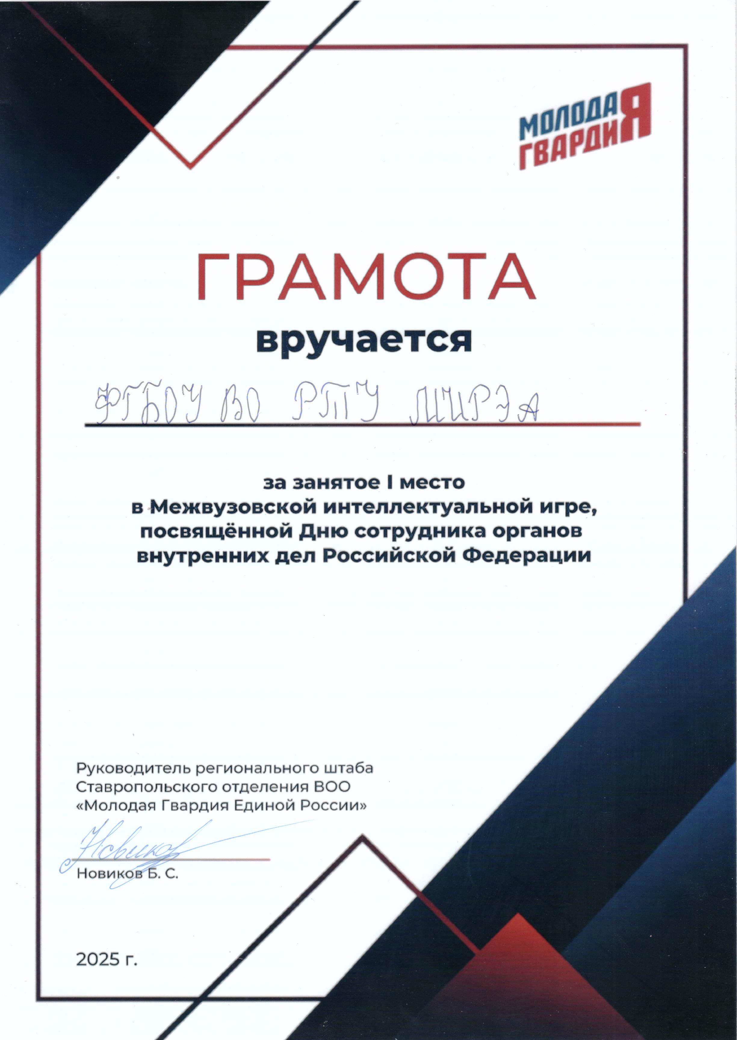 2025/2026 учебный год: Грамота за 1 место в межвузовской интеллектуальной игре — Филиал РТУ МИРЭА в г. Ставрополе