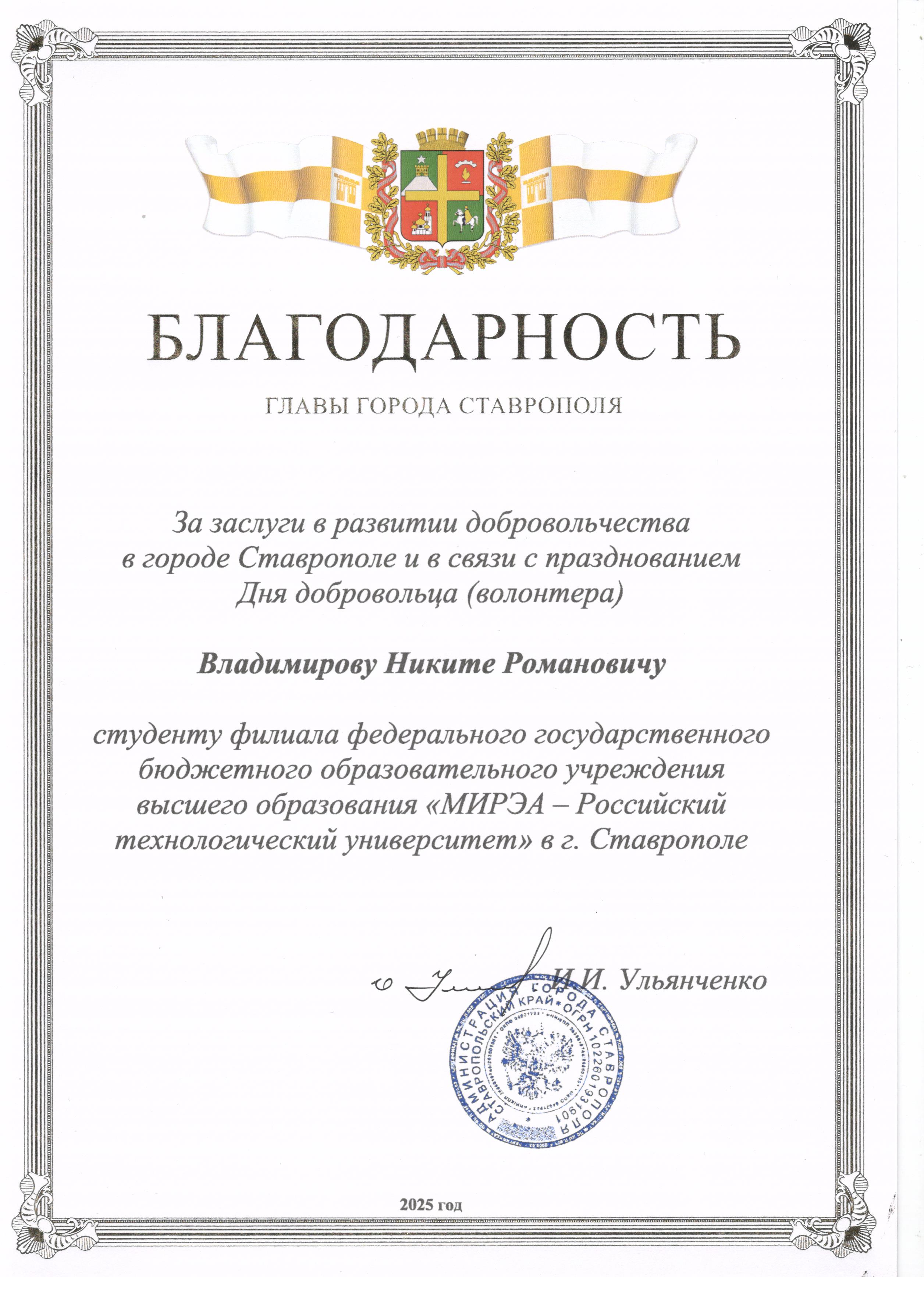 2025/2026 учебный год: Благодарность главы г. Ставрополя Владимирову Никите