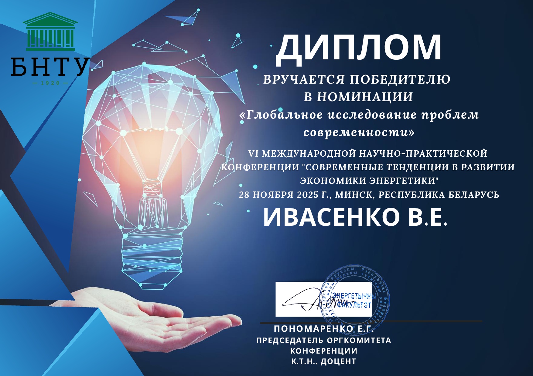 2025/2026 учебный год: Диплом победителя Ивасенко В.Е. в VI Международной научно-практической конференции «Современные тенденции в развитии экономики энергетики»